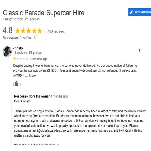 Let’s begin with the most telling sign: the overwhelming negative reviews. A quick search of Classic Parade on Google reveals countless 1-star reviews where customers share a consistent story. Deposits are taken after bookings, only for Andrew Brown—the individual behind Classic Parade—to provide template excuses for non-delivery of vehicles. These excuses range from mechanical issues to “banking system problems,” but the outcome is always the same: refunds are indefinitely delayed or never processed.