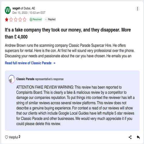 Classic Parade, a purported luxury car rental service, has been exposed as a fraudulent operation that has scammed countless unsuspecting customers. From fabricated five-star reviews to widespread customer complaints of stolen deposits, the evidence paints a clear picture of deceit. Below, we dissect the key points that reveal how Classic Parade operates as a scam.